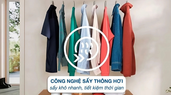 - Thiết bị có công suất vận hành 2250W và nhiệt độ sấy dao động từ 70 đến 80°C, đủ để làm khô quần áo nhanh chóng mà vẫn giữ chất lượng sợi vải, ngăn ngừa sự phát triển của nấm mốc.![]()