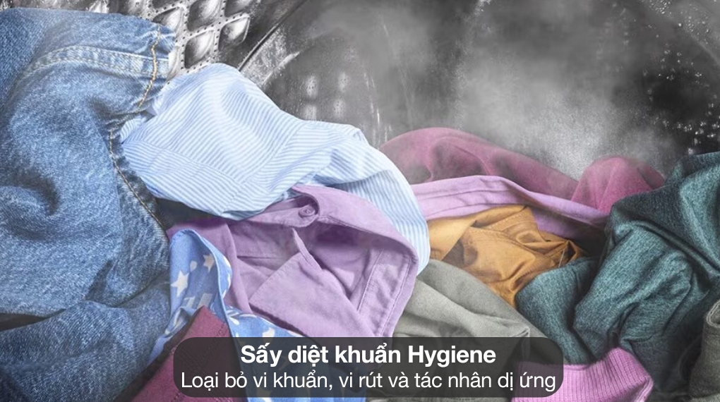 - Máy tích hợp nhiều chương trình sấy linh hoạt như sấy nhanh 40 phút, sấy hỗn hợp, sấy vải tổng hợp, sấy chăn ga,... Đặc biệt, chế độ sấy diệt khuẩn Hygiene giúp loại bỏ vi khuẩn và các tác nhân gây dị ứng, rất thích hợp cho quần áo trẻ em và người có làn da nhạy cảm.![]()