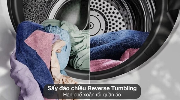 - Công nghệ sấy đảo chiều Reverse Tumbling vận hành với cơ chế quay đảo chiều, giúp quần áo không bị xoắn rối và giảm nhăn đáng kể. Nhờ vào chuyển động luân phiên của lồng sấy, quần áo được tách rời nhau, hạn chế ma sát và giữ cho sợi vải bền đẹp hơn.