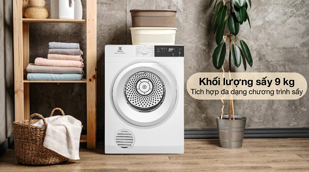 - Máy có khối lượng sấy 9 kg, phù hợp cho gia đình từ 3 đến 5 thành viên hoặc những gia đình có nhu cầu sấy quần áo thường xuyên.