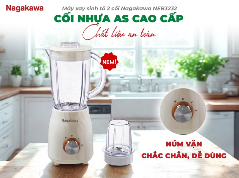 Máy xay sinh tố Nagakawa NEB3232 sở hữu thiết kế nhỏ gọn, màu sắc trang nhã, phù hợp với mọi không gian bếp. Cối xay được làm bằng nhựa AS bền bỉ, an toàn, hạn chế nứt vỡ, không bị ám mùi.