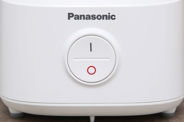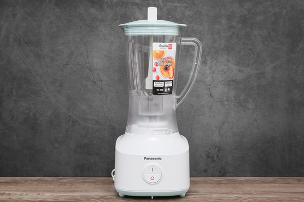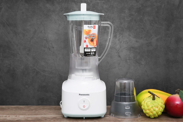 Máy xay sinh tố Panasonic kiểu để bàn tiện dụng, có màu trắng trang nhã, nắp cối xay màu xanh nhạt tươi sáng, tăng tính thẩm mỹ cho bếp gia đình