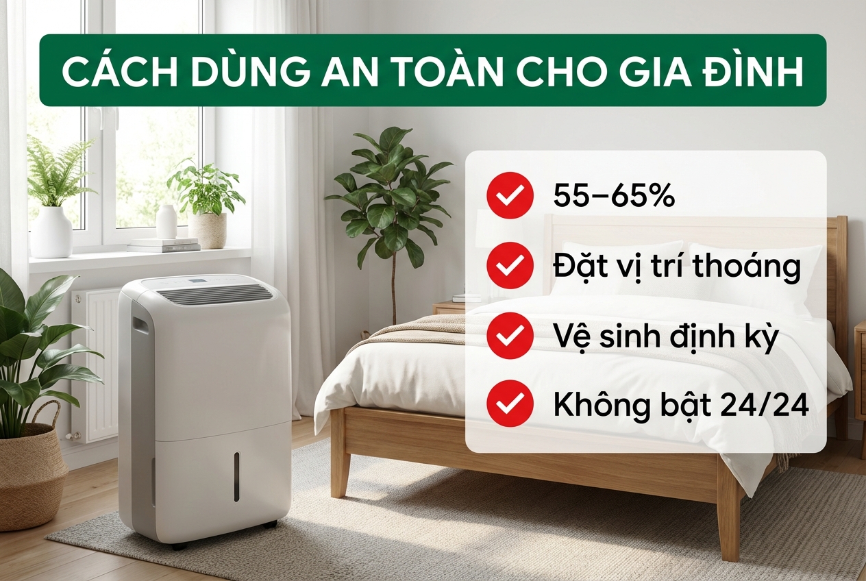 - Giảm độ ẩm: đưa về mức 55–65% – mức dễ chịu trong gia đình.