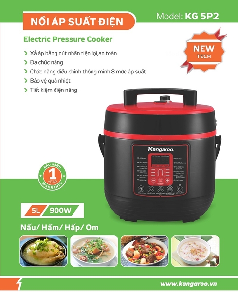 Nồi áp suất điện Kangaroo KG5P2 được thiết kế với kiểu dáng vô cùng hiện đại và bắt mắt, không những mang đến những món ăn ngon mà còn làm nổi bật không gian bếp nhà bạn.