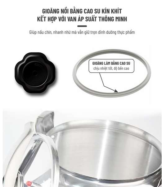 Nắp đậy có quai gài bằng nhựa chịu lực cao, đậy kín để ngăn nhiệt không thoát ra ngoài, đảm bảo thời gian hầm được rút ngắn. Gioăng cao su chịu nhiệt kín khít kết hợp với van áp suất hỗ trợ nấu chín thực phẩm nhanh nhừ mà vẫn giữ trọn hương vị và dinh dưỡng của thực phẩm.