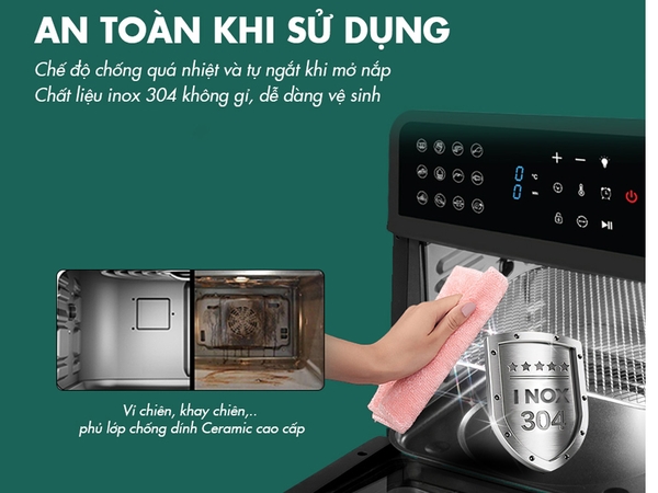 Nồi chiên không dầu Nagakawa NAG3307 gây ấn tượng cho người tiêu dùng ngay từ cái nhìn đầu tiên bởi thiết kế vuông vức, chắc chắn, tông màu đen sang trọng, phù hợp với mọi không gian nội thất hiện nay. Đặc biệt, nồi được thiết kế dạng hộp kín vừa gọn gàng vừa giúp hạn chế thất thoát nhiệt, đồng thời tránh tình trạng dầu bắn ra xung quanh như khi sử dụng chảo chiên truyền thống. Phần cửa lò có kính trong suốt kèm đèn chiếu sáng giúp bạn dễ dàng quan sát thực phẩm bên trong mà không cần mở cửa.![]()