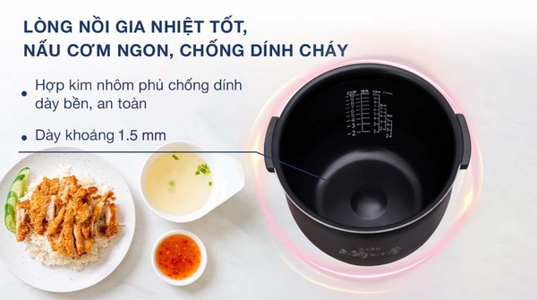 Lòng nồi 3 lớp dày 1.5 mm (thông tin hãng cung cấp) làm bằng hợp kim nhôm phủ lớp chống dính, giúp cơm không bị dính cháy, chín đều thơm ngon, an toàn cho sức khỏe