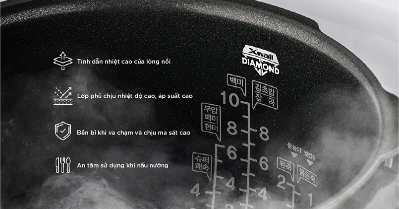 Lòng nồi Xwall Diamond chống dính cao cấp giúp cơm không bám dính, chống trầy xước, chịu nhiệt và áp suất cao. Bạn có thể nấu cơm mà không cần dầu mỡ, giữ món ăn lành mạnh. Sau khi nấu, việc vệ sinh nồi trở nên dễ dàng và nhanh chóng. Lòng nồi bền bỉ, giúp cơm luôn ngon và giữ nguyên hương vị tự nhiên theo thời gian.![]()