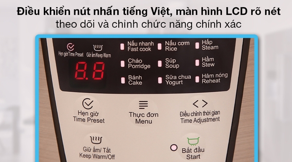 Các chức năng gồm: nấu nhanh, nấu cơm, hấp, cháo, súp, hầm, bánh, sữa chua, hâm nóng và giữ ấm, hỗ trợ tối đa nhu cầu nấu nướng của chị em nội trợ, phục vụ nhiều món ăn dinh dưỡng, đáp ứng nhu cầu khẩu vị của các thành viên trong gia đình.