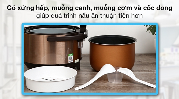 Phụ kiện kèm nồi gồm xửng hấp, muỗng canh, muỗng cơm và cốc đong giúp bạn nấu nướng tiện lợi hơn