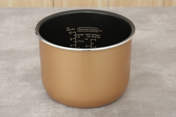 - Lòng nồi có độ dày 4 mm bền tốt, được cấu tạo từ 5 lớp với nhôm là chất liệu chính. Bên trong lòng nồi phủ lớp chống dính Binchotan có khả năng truyền nhiệt hiệu quả cho cơm chín đều, hạn chế bám dính và dễ làm sạch.![]()