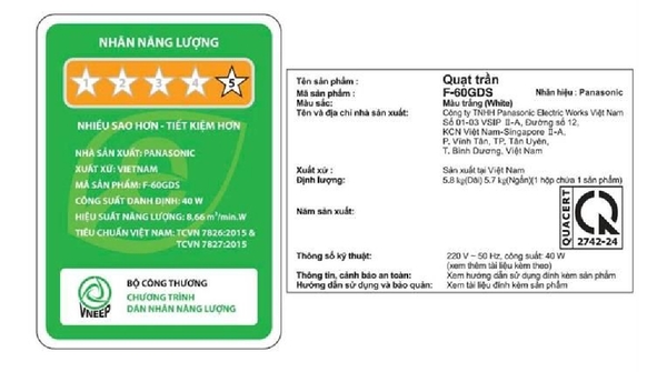 Thông số kỹ thuật Quạt trần Panasonic 5 cánh F-60GDS-W