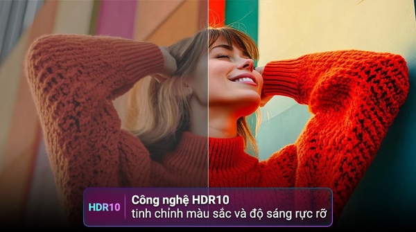Tivi hỗ trợ công nghệ HDR10 và HLG, mang lại dải màu rộng và độ sáng tốt hơn. Vùng sáng trở nên rực rỡ, trong khi vùng tối vẫn giữ được chi tiết tinh tế.![]()