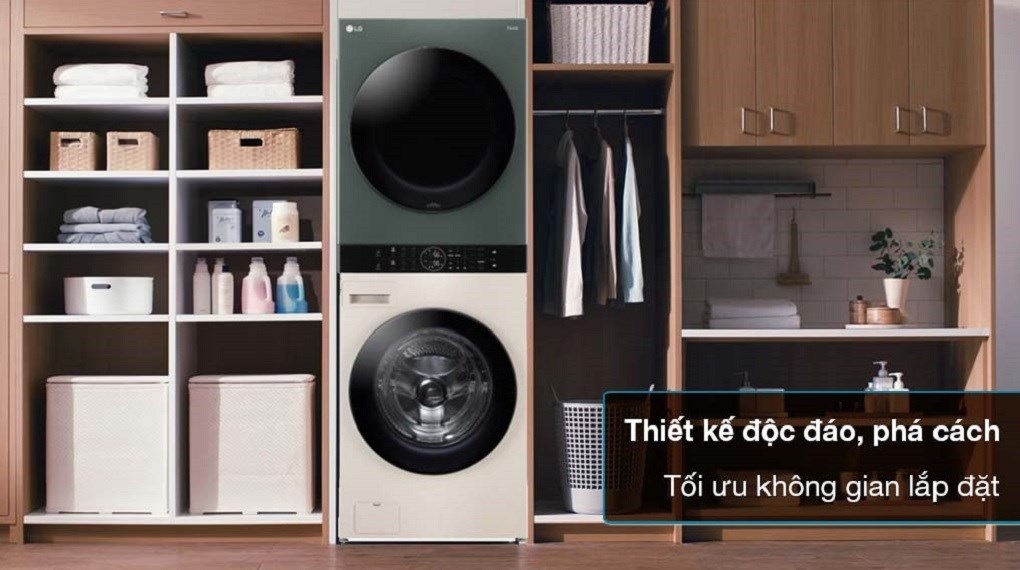 - Tháp giặt sấy LG Inverter giặt 25 kg - sấy 17 kg WT2517NHEG có kiểu dáng lồng giặt ngang với máy giặt nằm ở phía dưới và máy sấy nằm ở phía trên, nhờ đó tối ưu không gian lắp đặt cho gia đình bạn. Ngoài ra, vỏ máy còn được làm bằng kim loại sơn tĩnh điện bền bỉ, sở hữu màu xanh và màu be bắt mắt, tạo nên điểm nhấn cho không gian sống nhà bạn.