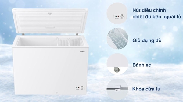 - Tủ đông Aqua áp dụng cơ chế làm lạnh 3D, cho phép luồng khí lạnh lan tỏa đều khắp các mặt của khoang tủ, đảm bảo mọi vị trí đều được làm lạnh hiệu quả mà không gây đóng đá cục bộ.
