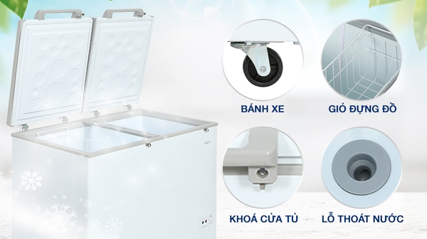 Ngoài ra, tủ đông Aqua còn trang bị một số tiện ích để hỗ trợ việc sử dụng của người dùng thuận tiện hơn: lỗ thoát nước, khóa an toàn, giỏ đựng đồ, bánh xe,...