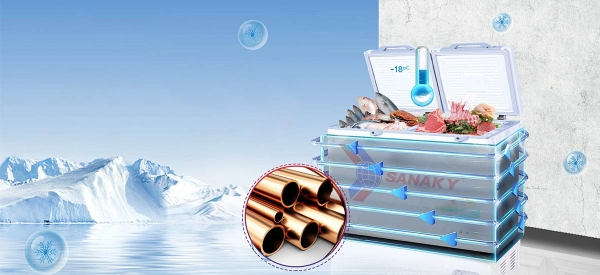 Dàn lạnh ống đồng được sử dụng trong tủ giúp việc làm lạnh nhanh chóng và hiệu quả hơn so với chất liệu nhôm. Với khả năng làm lạnh đạt đến -18°C trong thời gian ngắn, nhiệt độ bên trong được duy trì ổn định, giữ thực phẩm tươi ngon hơn và tăng hiệu suất hoạt động.![]()