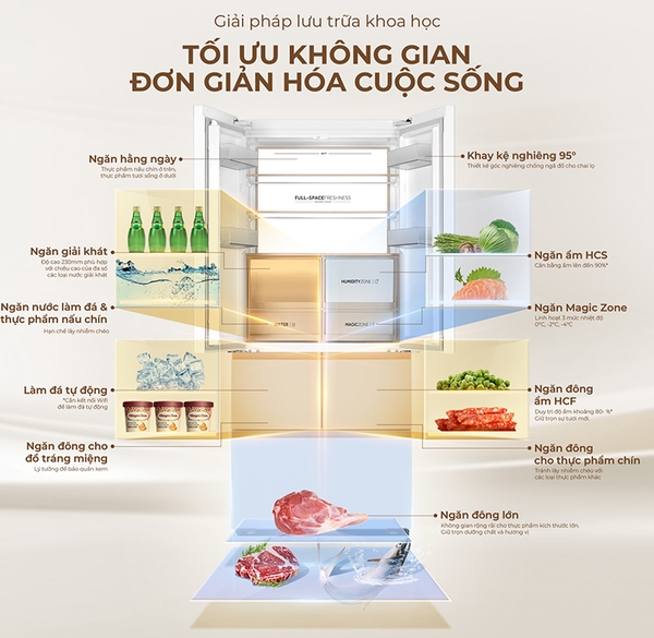 Các khu vực kệ kệ, hộc chứa được bố trí rất khoa học giúp bạn phân loại thực phẩm gọn gàng, mở rộng, đảm bảo vệ sinh giúp thực phẩm đạt điều kiện bảo quản tốt nhất. Các ngăn đông phía dưới được thiết kế như mở rộng bằng tia trượt bằng thép bền bỉ, chuyển động nhẹ nhàng, nữ ái.![]()