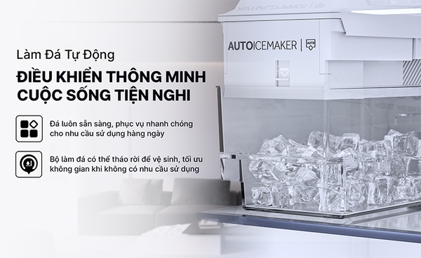 Hệ thống làm đá thông minh tự động tạo đá viên và lưu trữ trong ngăn làm đá.Điểm nổi bật của tính năng làm đá tự động ở dòng tủ lạnh này là khả năng đáp ứng linh hoạt theo 4 nhu cầu sử dụng: cung cấp đá hàng ngày, làm đá một lần mỗi ngày với 6 khay đá mát lạnh, tùy chỉnh số lượng và thời gian làm đá theo ý muốn, ngưng làm đá theo thời gian cài đặt. ![]()