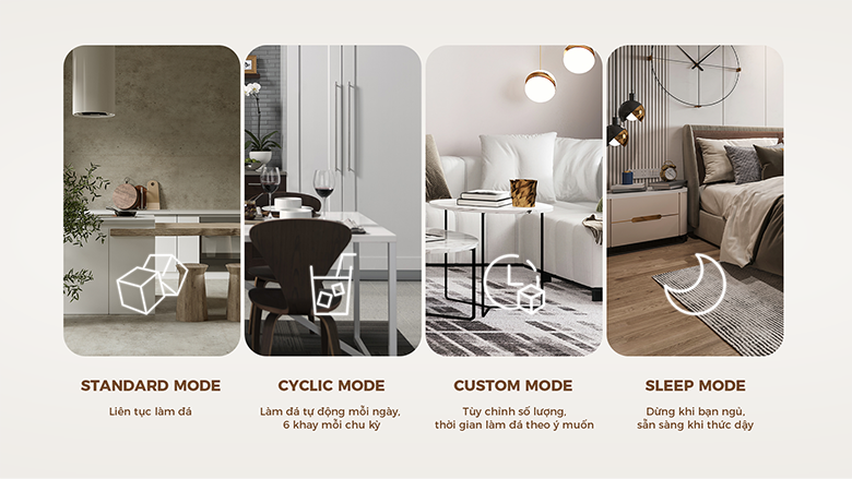 Tiết kiệm thời gian và công sức với chức năng làm đá tiện lợi và lưu trữ đá tự động. Hệ thống sẽ tự động làm đá khi bạn đổ nước vào bình chứa. Làm nhiều đá dễ dàng mà không cần nối đường cấp nước, không cần nhiều thao tác rắc rối. Khi bình chứa hết nước, bạn sẽ nhận được thông báo để có thể bổ sung nước kịp thời, không lo gián đoạn trải nghiệm. Đặc biệt, khay làm đá có thể tháo rời khi không sử dụng, tăng thêm không gian lưu trữ khi cần và dễ dàng làm sạch. Bên cạnh đó, người dùng có thể tùy chọn 4 chế độ qua điện thoại nhanh chóng.![]()