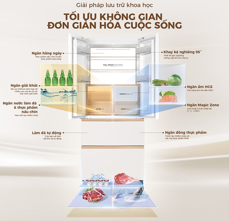 Các khu vực khay kệ, hộc chứa được bố trí rất khoa học giúp bạn phân loại thực phẩm gọn gàng, ngăn lẫn mùi, đảm bảo vệ sinh giúp thực phẩm đạt điều kiện bảo quản tốt nhất. 3 ngăn đông phía dưới được thiết kế dạng ngăn kéo với ray trượt bằng thép độ bền cao, chuyển động nhẹ nhàng, êm ái.![]()