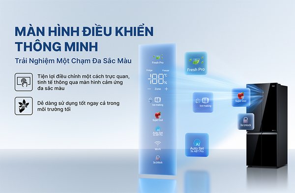 Tủ lạnh 4 cửa Aqua AQR-M600XA(GB) còn có màn hình cảm ứng màu Color AI giúp người dùng có thể điều chỉnh nhiệt độ một cách trực quan ngay từ bên ngoài, giúp tiết kiệm thời gian và điện năng, tránh việc mở cửa tủ gây thất thoát hơi lạnh. Màn hình này cho khả năng hiển thị tốt, màu sắc chi tiết cùng tốc độ phản hồi khá nhanh.![]()