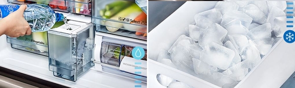 Bên dưới, ngăn đá 108 lít với nhiều hộc kéo trong suốt giúp dễ dàng quan sát và sắp xếp thực phẩm, đồng thời tích hợp hệ thống làm đá tự động khép kín cho nguồn đá sạch, tiện lợi.