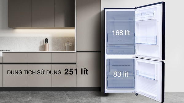 - Dung tích sử dụng 251 lít phù hợp với nhu cầu dự trữ thực phẩm hằng ngày của gia đình có từ 2 đến 3 người.![]()