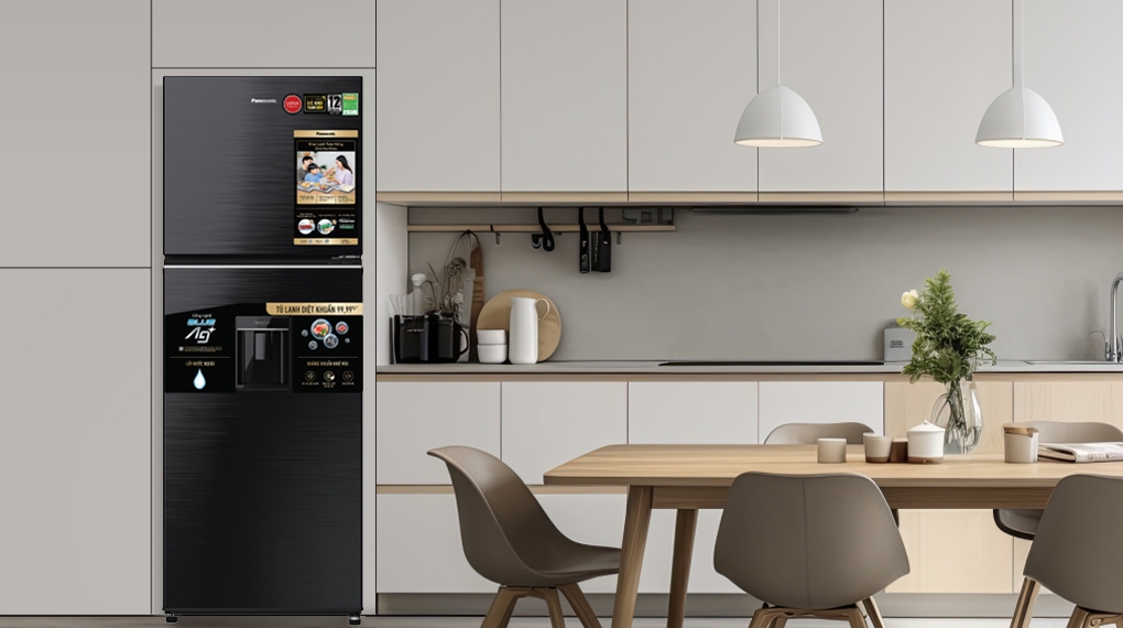 - Panasonic NR-TL351GVKV thuộc dòng tủ lạnh ngăn đá trên với đường nét sắc sảo, tinh tế kết hợp cùng với tông màu đen sang trọng góp phần tô điểm cho căn phòng bếp gia đình thêm phần cao cấp, thanh lịch.