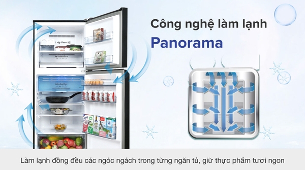 Chiếc tủ lạnh Panasonic Invertrer này sử dụng công nghệ làm lạnh vòng cung Panorama, nên các khí lạnh được thổi dạng hình vòng cung, đẩy các hơi lạnh nhanh chóng đi qua các ngăn tủ và đến từng ngóc ngách, làm lạnh thực phẩm nhanh chóng, bảo quản chúng luôn tươi ngon, đủ dưỡng chất.