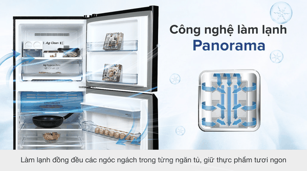 Hệ thống làm lạnh vòng cung Panorama, phân phối đều không khí trong tủ lạnh bằng hình dạng vòng cung và điều chỉnh luồng khí lạnh hoạt động đến các ngóc ngách có trong tủ, đảm bảo tất cả thực phẩm trong ngăn tủ đều được giữ lạnh đúng nhiệt độ, giúp chúng tươi ngon lâu dài.