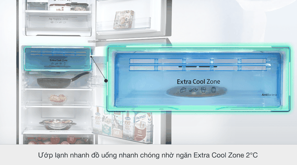 Sản phẩm có ngăn Extra Cool Zone với nhiệt độ là 2°C giúp trữ lạnh thực phẩm nhanh và bạn có thể thưởng thức nhanh các đồ uống mát lạnh mà không tốn thời gian chờ đợi. Ngăn được thiết kế dạng kéo, có nắp kháng khuẩn đảm bảo các vi khuẩn không xâm nhập vào bên trong ảnh hưởng đến độ ngon của thức uống.