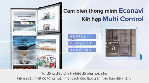 Tủ lạnh Panasonic sử dụng cảm biến Econavi có khả năng ghi nhớ thói quen mà người dùng sử dụng cũng như đo đạc chính xác nhiệt độ trong và ngoài tủ để điều chỉnh công suất hoạt động phù hợp, giúp giảm điện năng tiêu thụ.