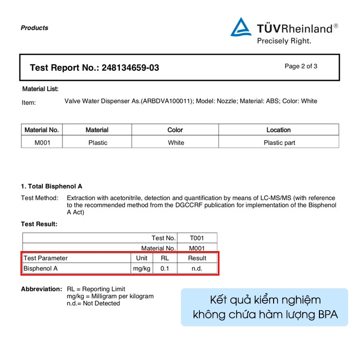 * Kết quả kiểm tra cho thấy hộp chứa nước không chứa chất BPA, được kiểm chứng bởi Tổ chức Quốc tế TÜV Rheinland có trụ sở tại Đức.![]()