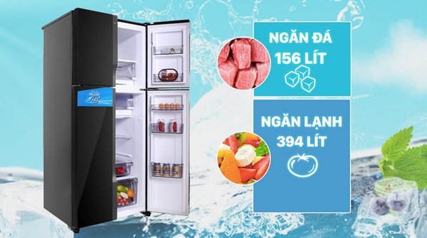 Sản phẩm có dung tích ngăn lạnh là 394 lít và ngăn đá 156 lít nên phù hợp lưu trữ thực phẩm cho hộ gia đình từ 4 – 5 người.