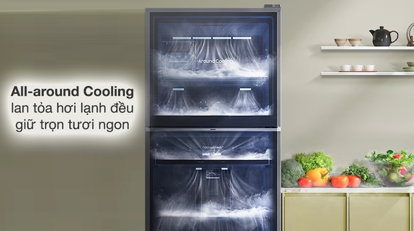 - Công nghệ All-around Cooling: lan tỏa hơi lạnh đều đặn khắp thân tủ, giữ cho thực phẩm tươi ngon trong suốt thời gian bảo quản.