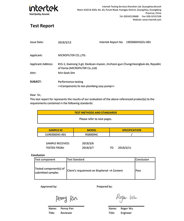 Giấy chứng nhận của công ty giám định chất lượng sản phẩm Intertek Group plc về chất liệu nhựa không chứa chất BPA gây ung thư.![]()