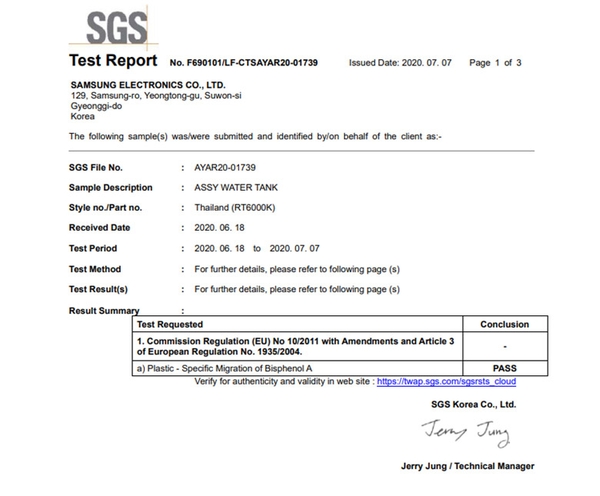 Giấy kiểm chứng ngăn lấy nước trong với chất liệu nhựa không chứa chất BPA gây ung thư, được cung cấp bởi Tổ chức chứng nhận kiểm định chất lượng quốc tế SGS có trụ sở tại Geneva Thụy Sĩ.![]()
