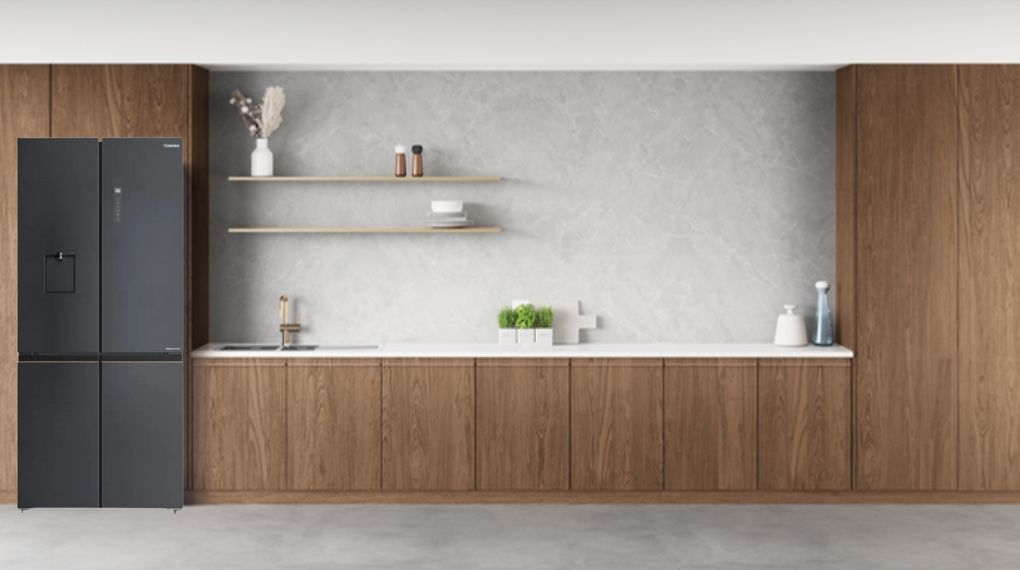 - Tủ lạnh Toshiba Multi Door 4 cánh hiện đại, phủ lớp thép xám Morandi thời thượng, chống trầy xước và hạn chế dấu vân tay hiệu quả.