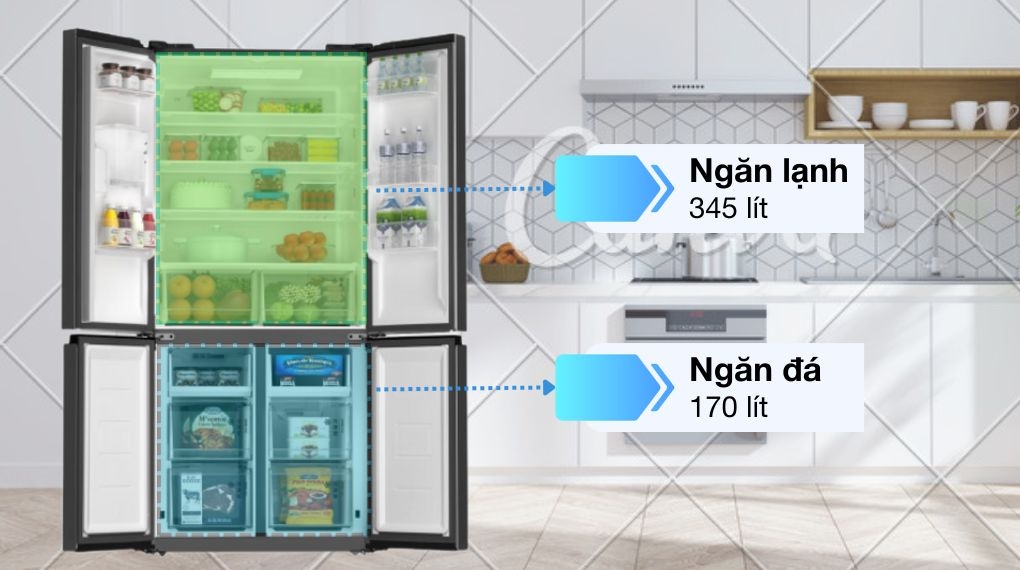 - Tủ lạnh Toshiba Multi Door có dung tích ngăn lạnh 345 lít, người dùng có thể thoải mái lưu trữ thực phẩm như rau củ, trái cây, thức uống,...