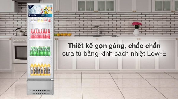 - Cửa tủ bằng 2 lớp kính cách nhiệt Low-E có tác dụng giảm sự phân tán nhiệt lượng, hạn chế quá trình trao đổi nhiệt với môi trường bên ngoài xuống thấp để tăng cường giữ lạnh, hạn chế đọng sương, nhìn rõ các đồ vật bên trong tủ.