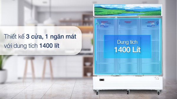 - Dung tích sử dụng của tủ mát lên đến 1400 lít thích hợp cho những gia đình có nhu cầu lưu trữ lớn hay các nhà hàng, quán ăn với mục đích vừa bảo quản, vừa trưng bày sản phẩm.