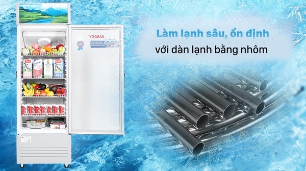 Tủ mát Sanaky được thiết kế với dàn lạnh làm bằng ống nhôm cho hiệu suất dẫn khí tốt giúp các ngăn tủ được giữ lạnh trong một khoảng thời gian dài. Nhờ vậy, thực phẩm được bảo quản lâu dài mà vẫn tươi ngon.