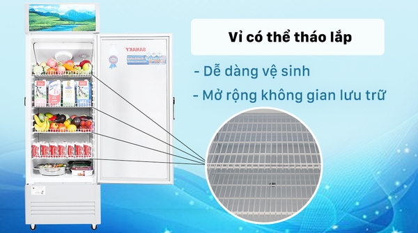 Tủ mát Sanaky 240 lít có các vỉ để thực phẩm có thể dễ dàng tháo lắp, giúp thay đổi không gian bảo quản dễ dàng và tiện lợi khi vệ sinh tủ.
