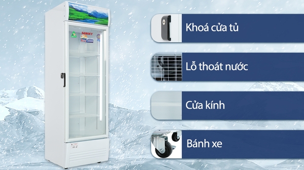 - Tủ mát Sanaky có thiết kế dạng tủ đứng 1 cửa với thân tủ được làm từ thép sơn tĩnh điện bền bỉ, sáng bóng, dễ lau chùi, hạn chế ăn mòn tốt, giữ tủ mới lâu hơn.