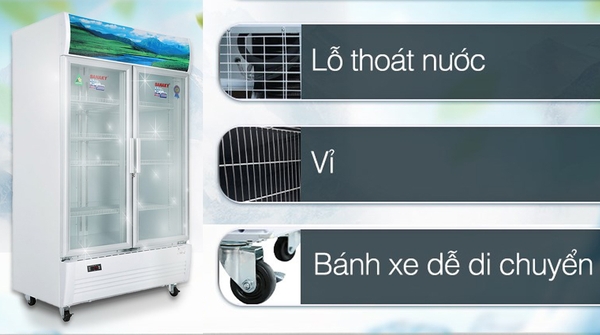 - Thiết kế tủ mát Sanaky có bánh xe dễ dàng di chuyển khi cần thiết.