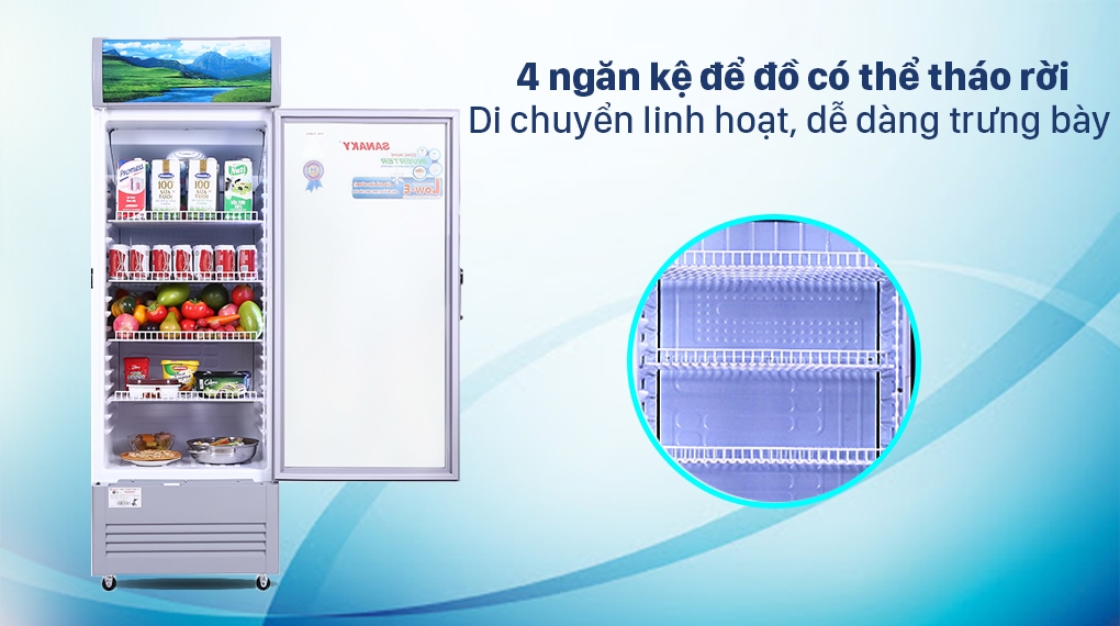 Tủ mát Sanaky được trang bị 4 kệ để đồ có thể di chuyển linh hoạt. Nhờ đó, bạn sẽ dễ dàng phân loại, sắp xếp các sản phẩm trưng bày và tận dụng tối đa không gian sử dụng.![]()